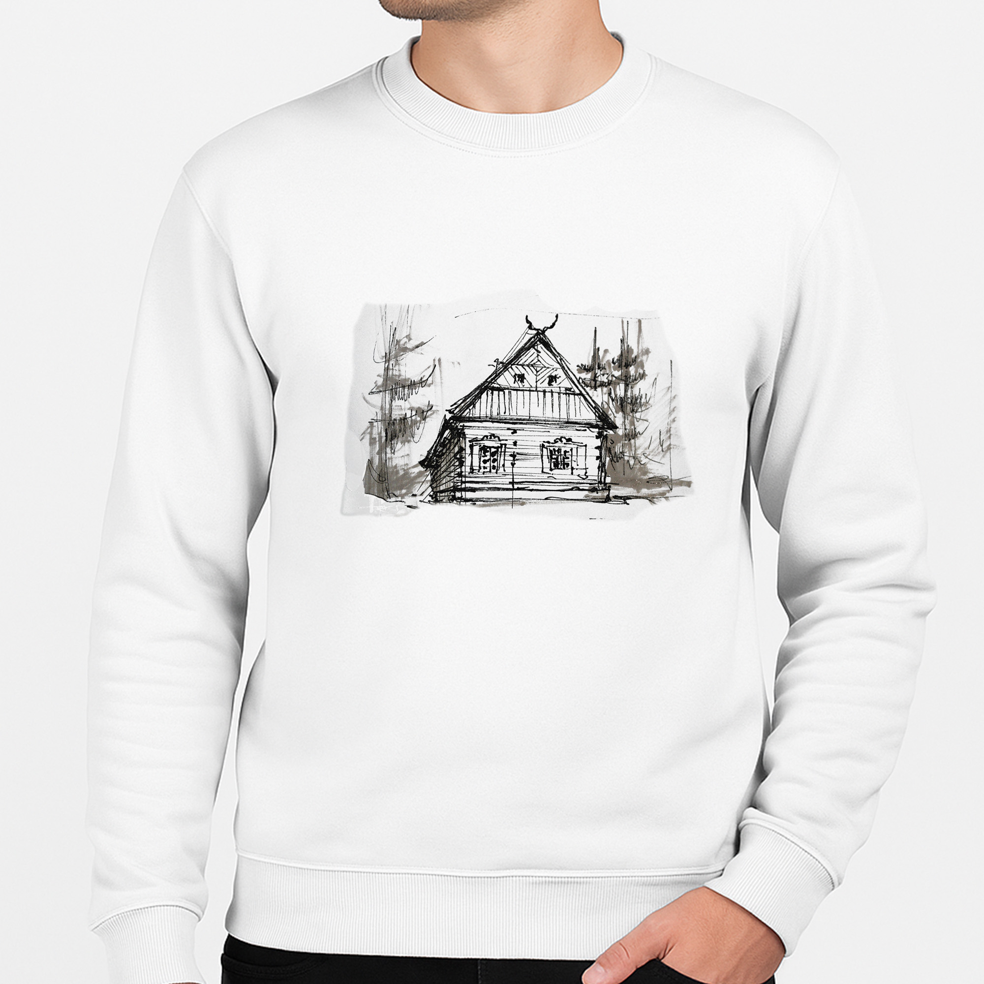 Artystyczny rysunek kurpiowskiej chaty ukazuje piękno drewnianego budownictwa i charakterystyczne śparogi zdobiące dach.
