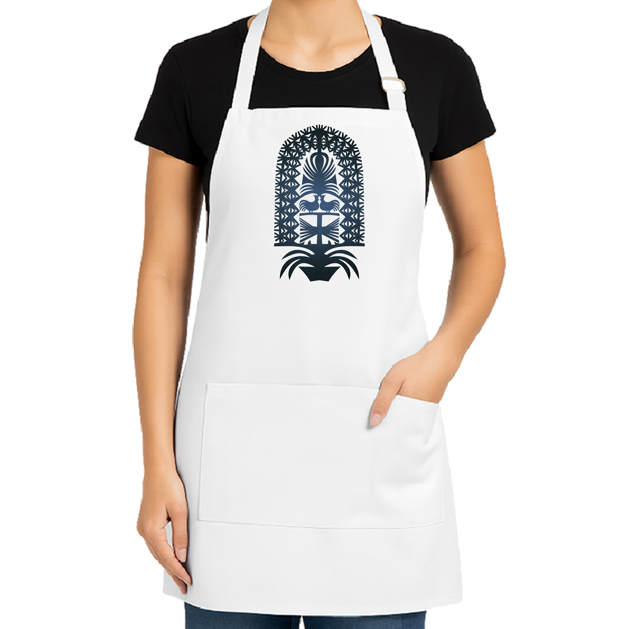 - pasek na szyi ma regulowaną długość, więc wysokoś fartucha można regulować. Regulacja paska przy pomocy plastikowej białej sprzączki