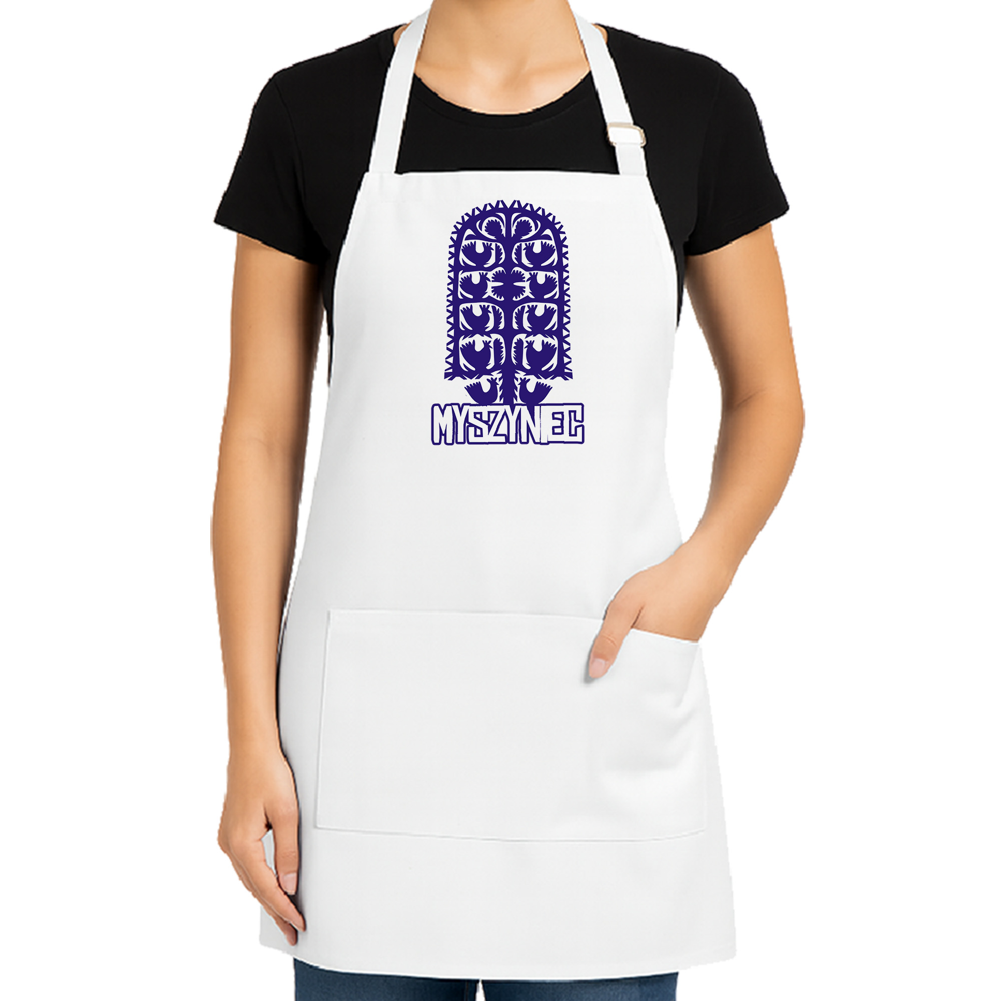 • pasek na szyi ma regulowaną długość, więc wysokoś fartucha można regulować. Regulacja paska przy pomocy plastikowej białej sprzączki