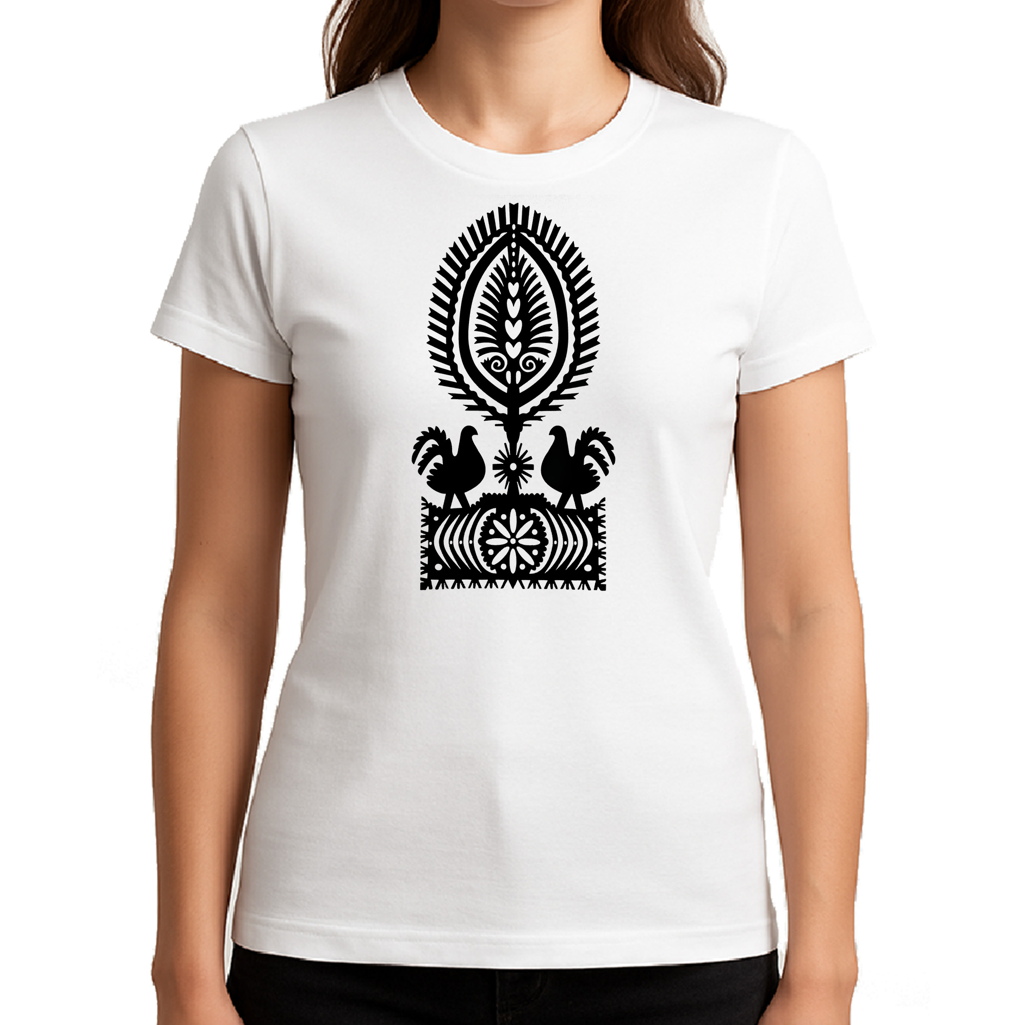 Napis z kogutami w stylu kurpiowskim przypomina o tęsknocie za domem i powrocie do źródeł – tam, gdzie dusza oddycha swobodnie.