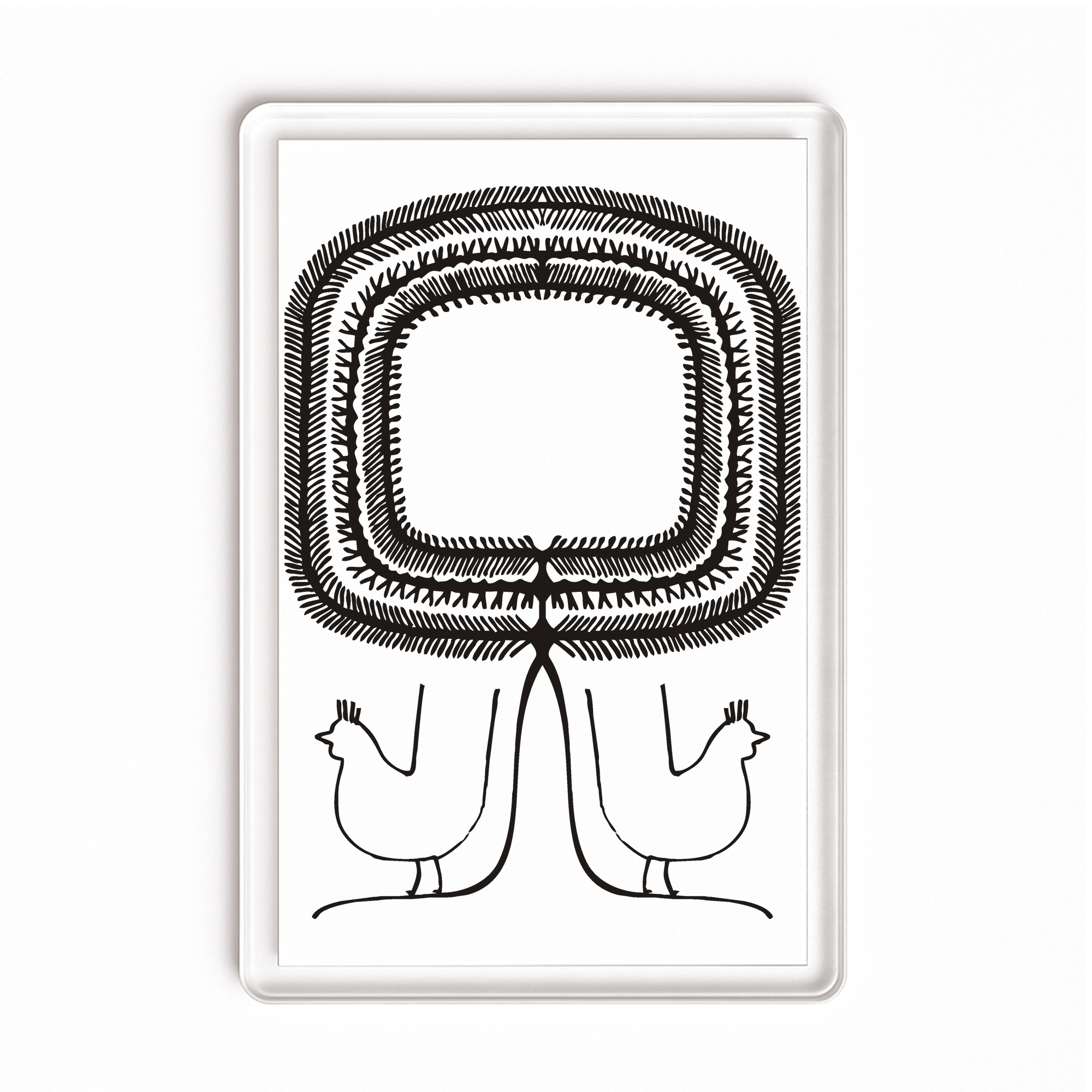 Motyw kurpiowski z dwoma kogutami pod drzewem życia – wyraz sztuki ludowej regionu, zakorzenionej w przyrodzie i tradycji.