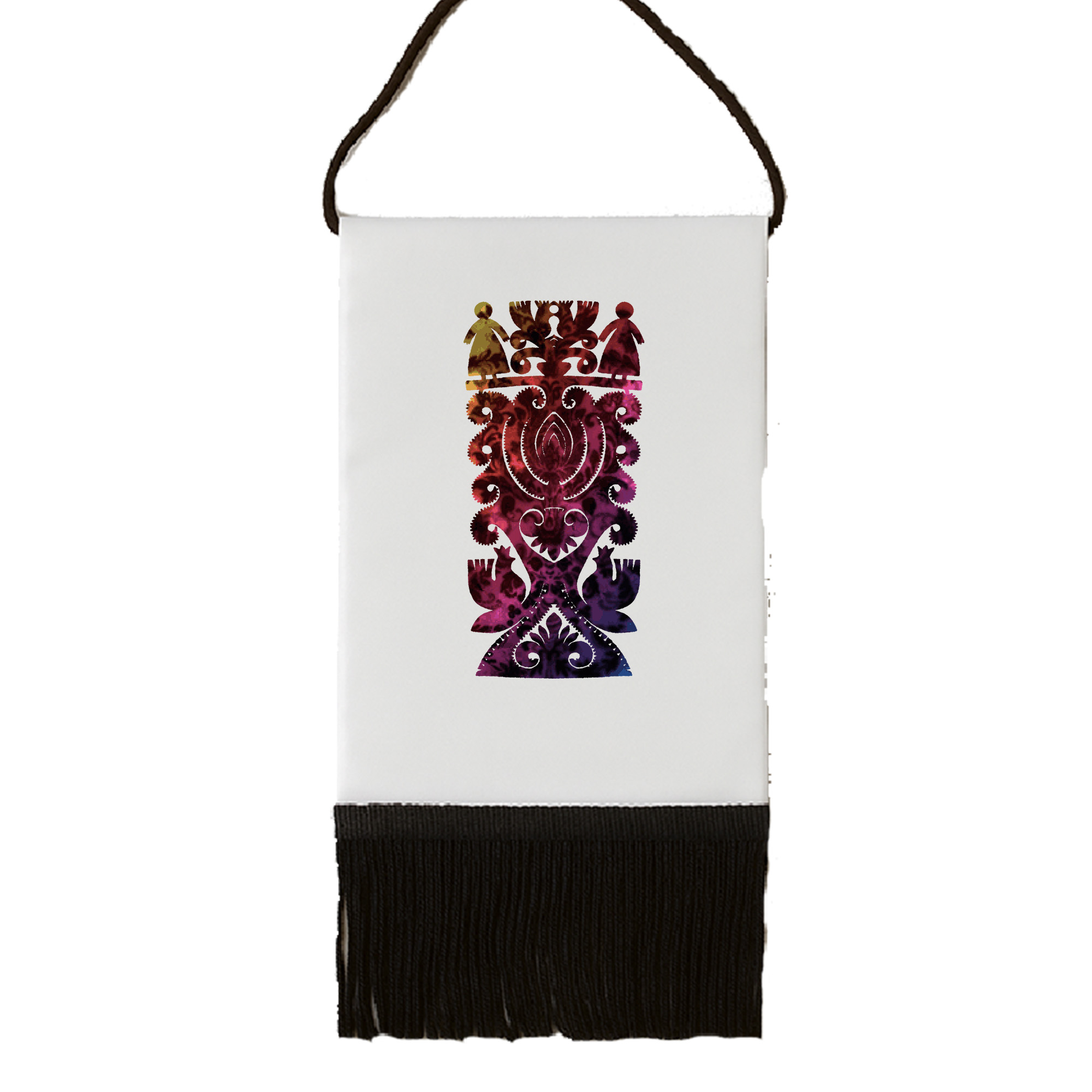 • frędzle i zawieszka wykonane z czarnego poliestrowego sznurka (wrażliwe na temperaturę – nie prasować)